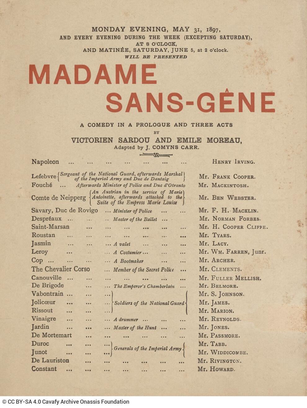 Two copies of the theatre programme of the Royal Lyceum Theatre in London for the play Madame Sans-Gêne by Victorien Sardou and Émile Moreau under the artistic direction of Henry Irving. The adaptation of the play was undertaken by J. Comyns Carr.