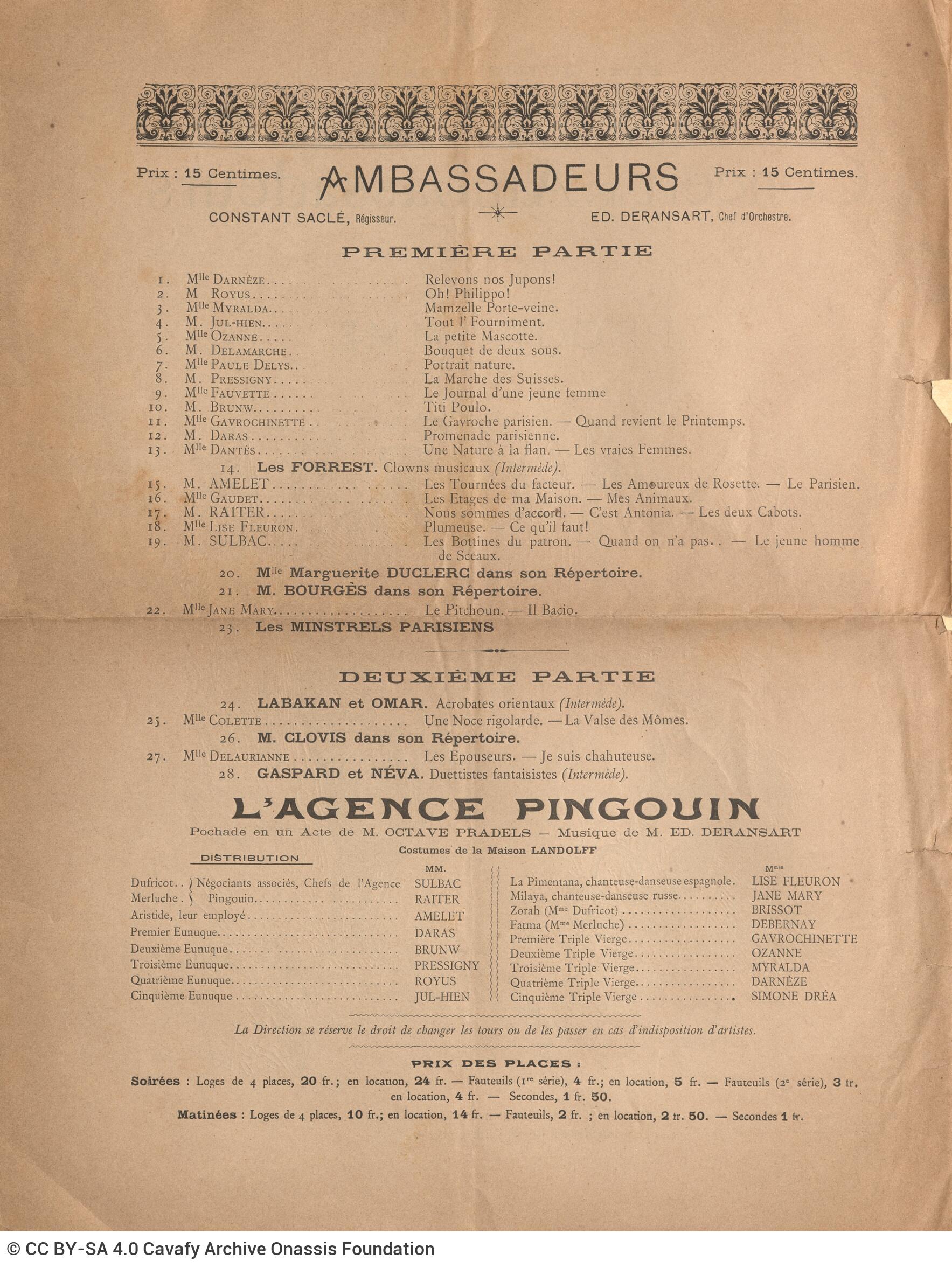 Le Courrier français (journal). “Programme of the shows at “Concert des Ambassadeurs””. Event programme, 16.05.1897. GR-OF CA CA-SF02-S02-F25-SF009-0018 (2139), Onassis Foundation C. P. Cavafy Fonds. From The Digital Collection of the Cavafy Archive, edited by Onassis Foundation, Athens, last modified 01.10.2025. https://doi.org/10.26256/CA-SF02-S02-F25-SF009-0018.